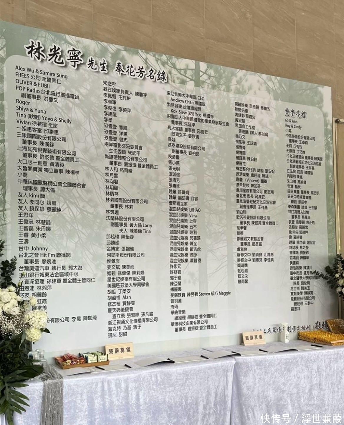 现场统计将近百位演艺圈人士以花篮方式送别林光宁,奉花芳名录上包含张惠妹、修杰楷、贾静雯、吴奇隆、庾澄庆等人。