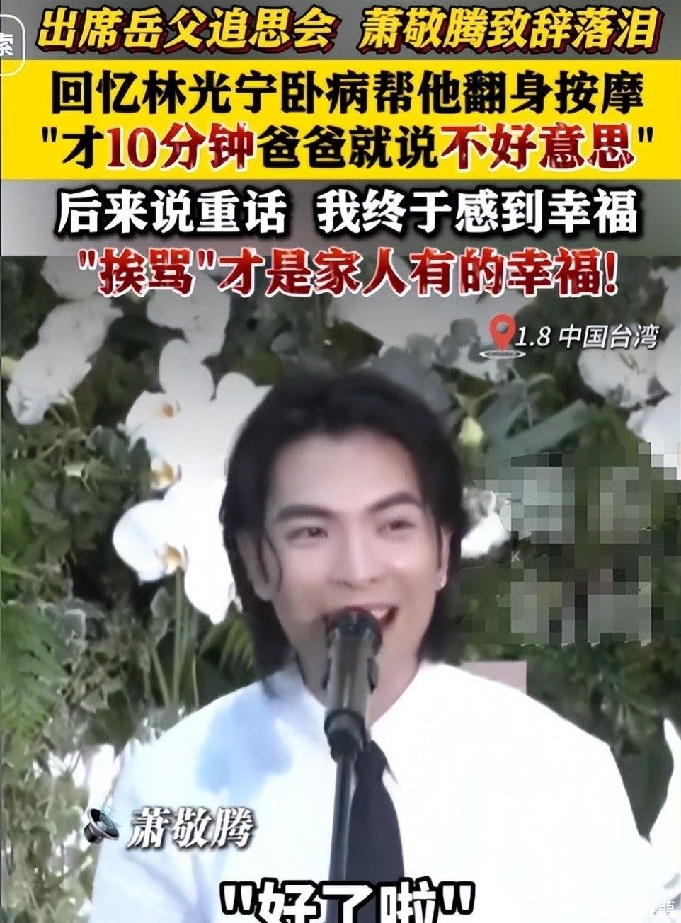 当轮到他上台致词时,萧敬腾哽咽说道:“我的岳父林光宁是我永远的骄傲,您放心!我会努力照顾好这个家,我是您永远的女婿萧敬腾。爸,我爱您!”